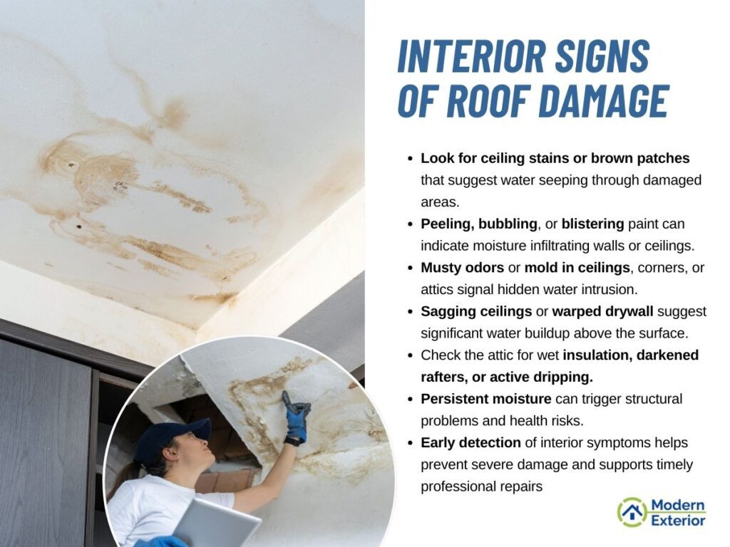 Sometimes hail damage isn’t immediately visible from the outside, but its effects can show up inside your home. Checking your ceilings, walls, and attic for these warning signs can help you catch roof issues before they lead to serious water damage or mold growth.