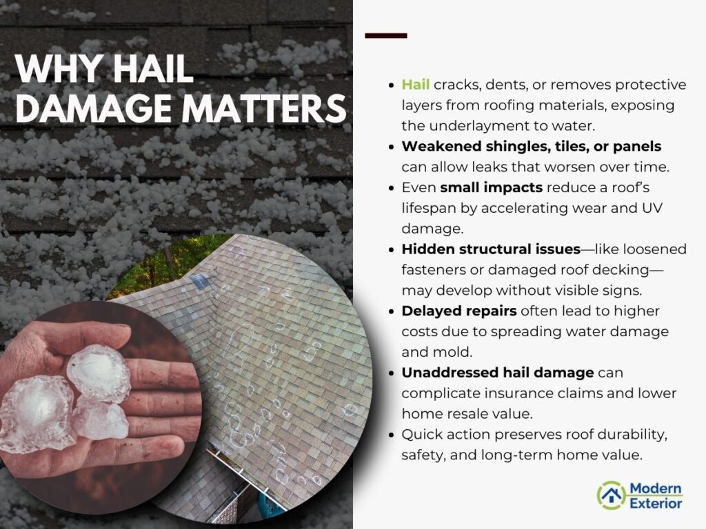 In short, addressing hail damage promptly protects your investment, preserves your roof’s durability, and helps maintain your home’s safety and value.