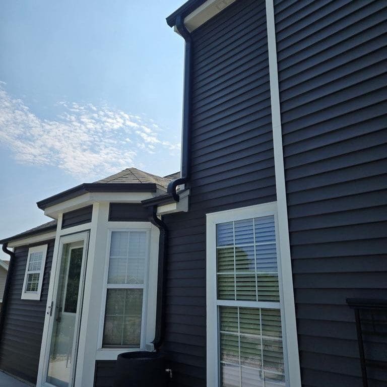 These custom-fit seamless gutters improve water flow efficiency and prevent leaks, protecting the home’s foundation, roofing, and landscaping from costly water damage. The installation also enhances the home’s exterior appearance, complementing the freshly updated siding with clean lines and a polished finish.